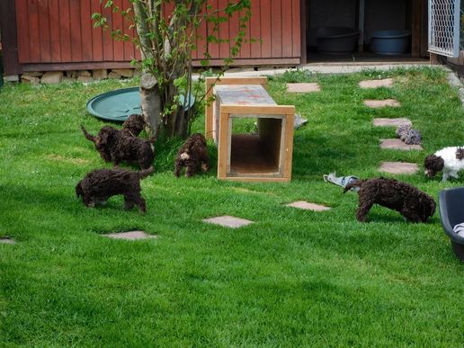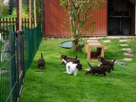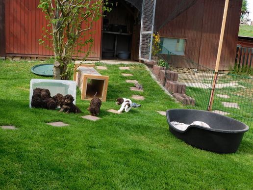 so schnell geht dann die Entwicklung. Aus dem kleinen Bereich wird ein mittelgroßer und dann ein großer Bereich wo man ausgelassen spielen kann. Alle entwickeln sich prächtig. Noch kann ich die Welpen nicht endgültig zuordnen, weil noch nicht alle Familien bei uns zu Besuch waren. Bitte noch etwas Geduld.